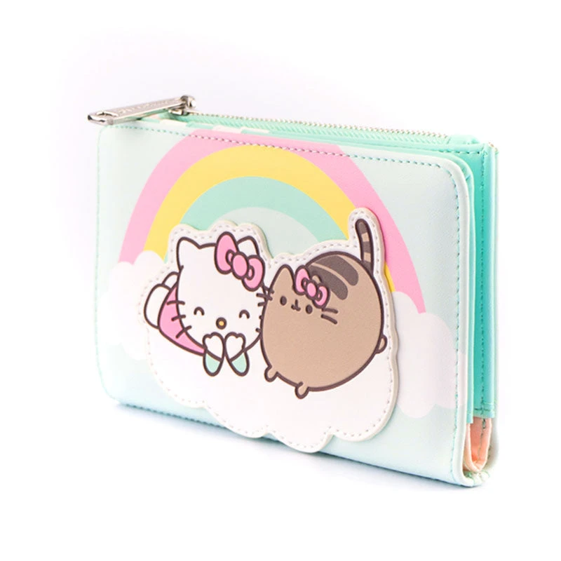 The New Hello Kitty x Pusheen Wallet from Loungefly is the perfect collectible item for Sanrio & Pusheen fans. It features cute applique design of Hello Kitty and Pusheen lounging on a cloud with a cute pastel rainbow printed behind them. Inside there are 7 card slots, a clear ID slot, and a zipper pocket for spare change, a bills compartment, and a pink and white cloud printing lining.