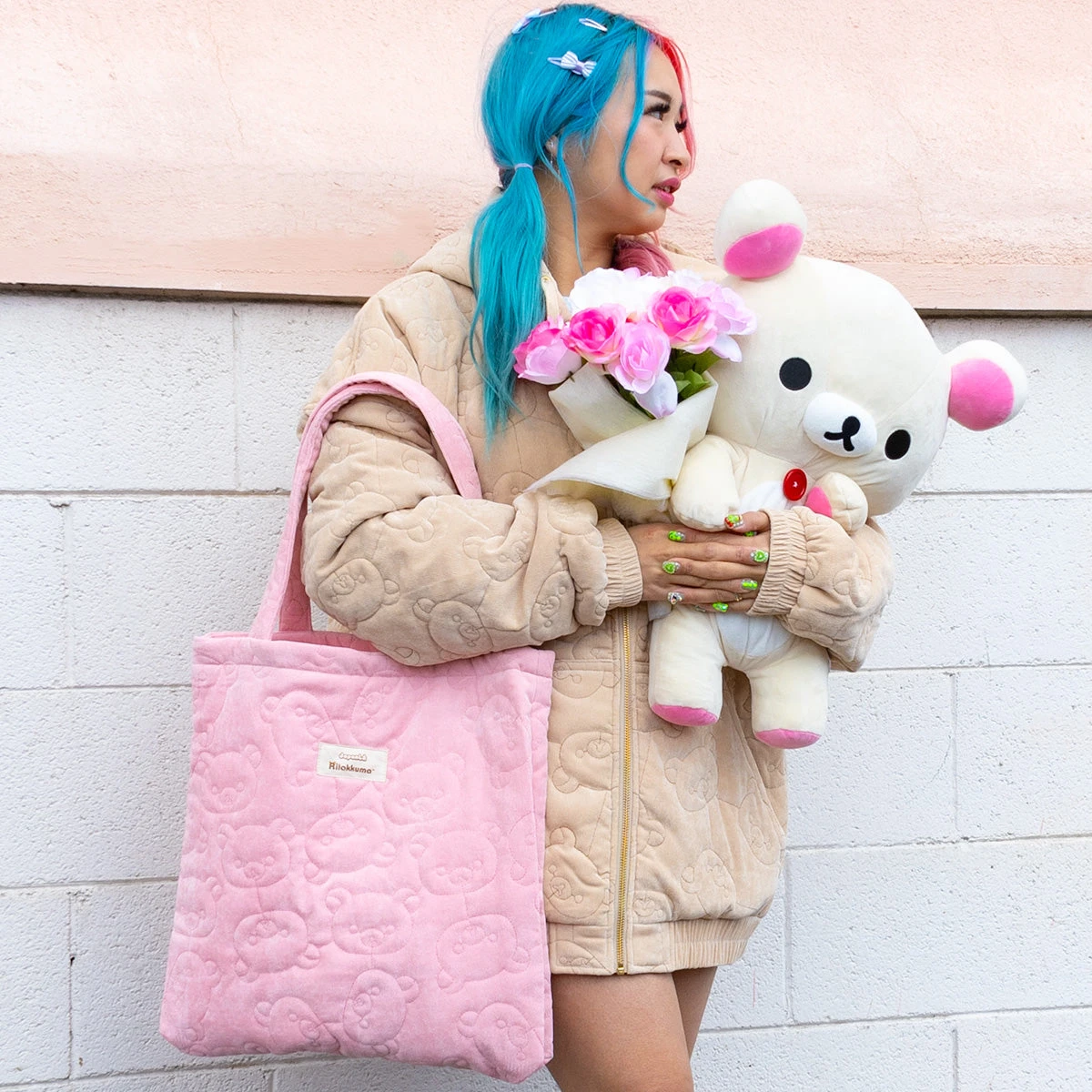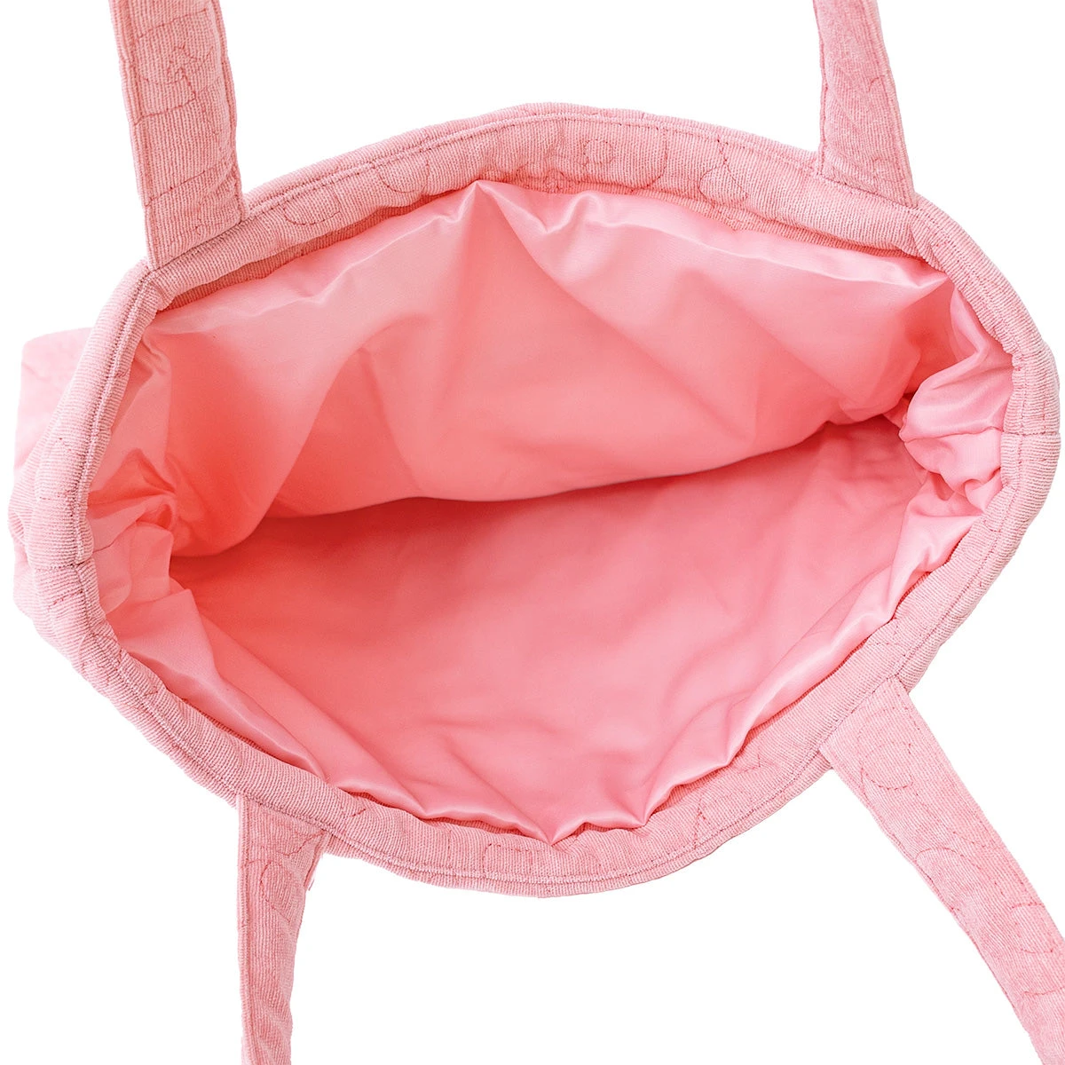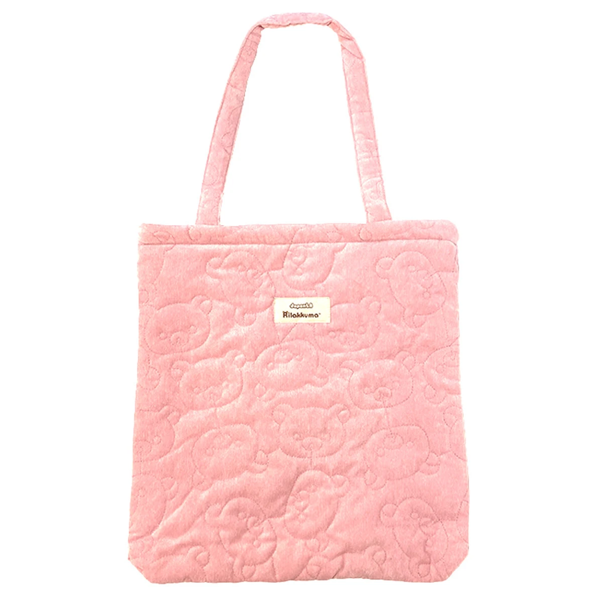 This cute tote bag is made with a blush pink corduroy fabric, stitched with an all-over Korilakkuma face quilted design! The inside of the bag is made with a soft satin fabric.