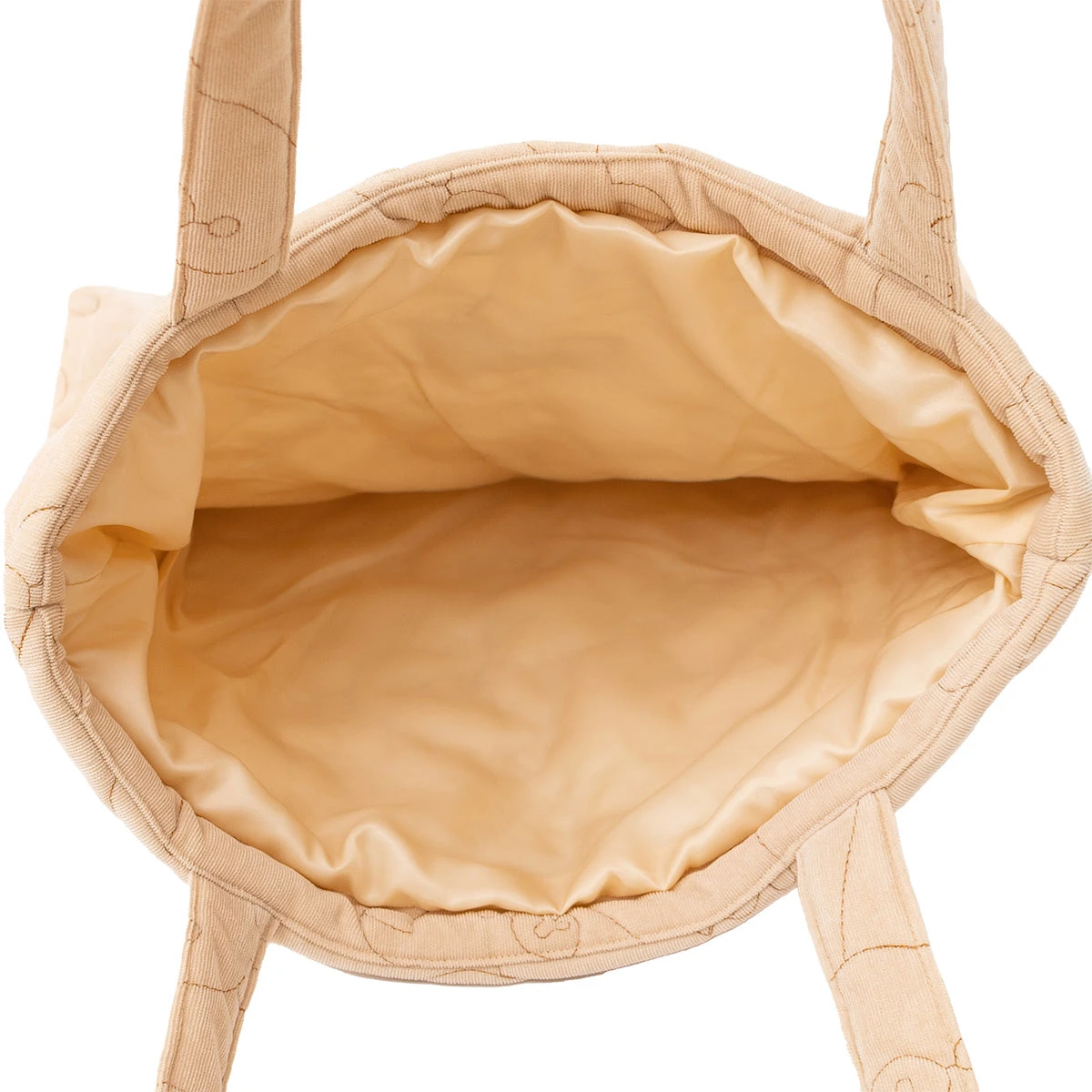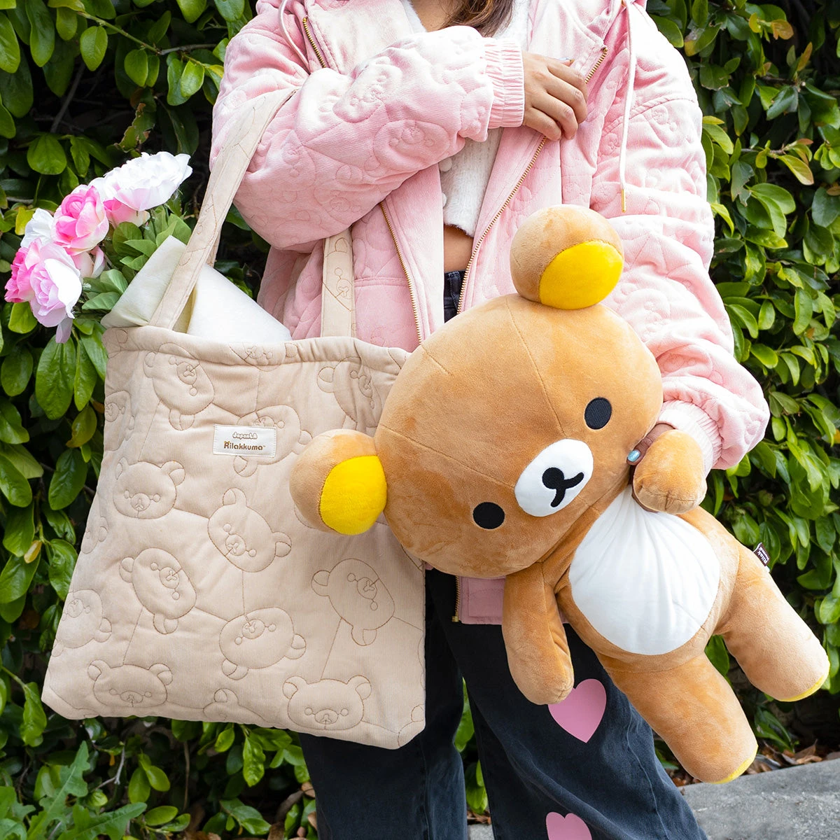 This cuteĀ tote bagĀ is made with a milk tea brown corduroy fabric, stitched with an all-over Rilakkuma face quilted design! The inside of the bag is made with a soft satin fabric.