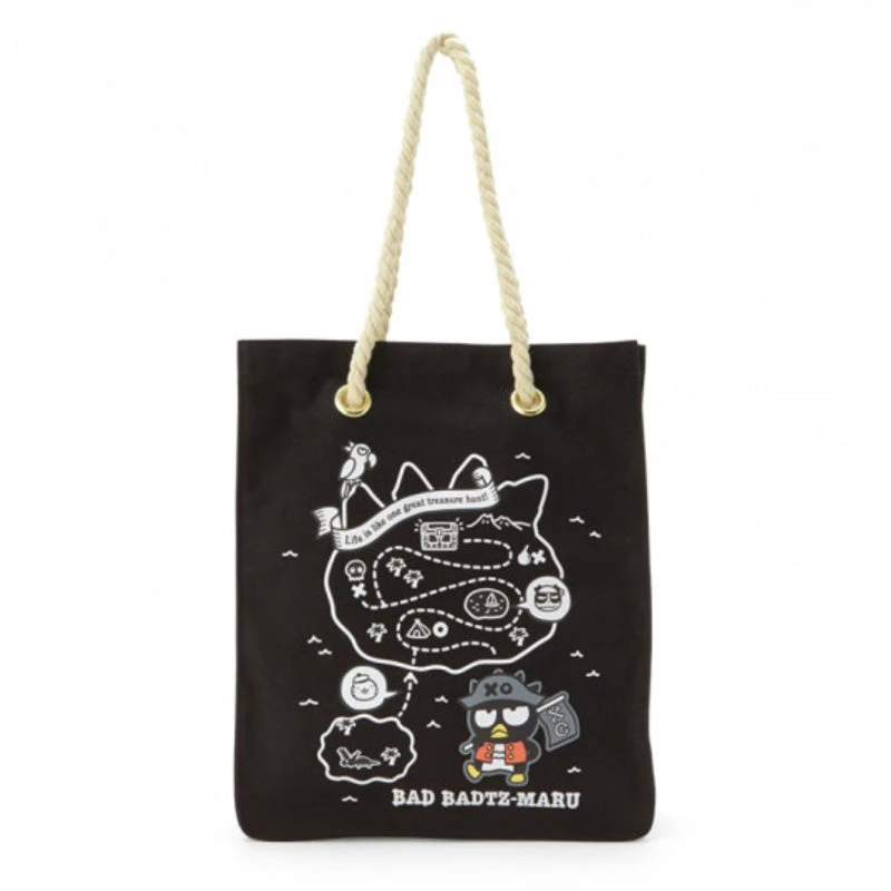 Yarrr! This here pirate-themed Badtz Maru tote bag will fit all o’ yer precious treasures. The Sanrio bag is made with rope-styled straps and a small pocket inside to fit all o’ yer doubloons. Carry yer goodies across the seven seas with this here swashbucklin’ Sanrio tote bag!