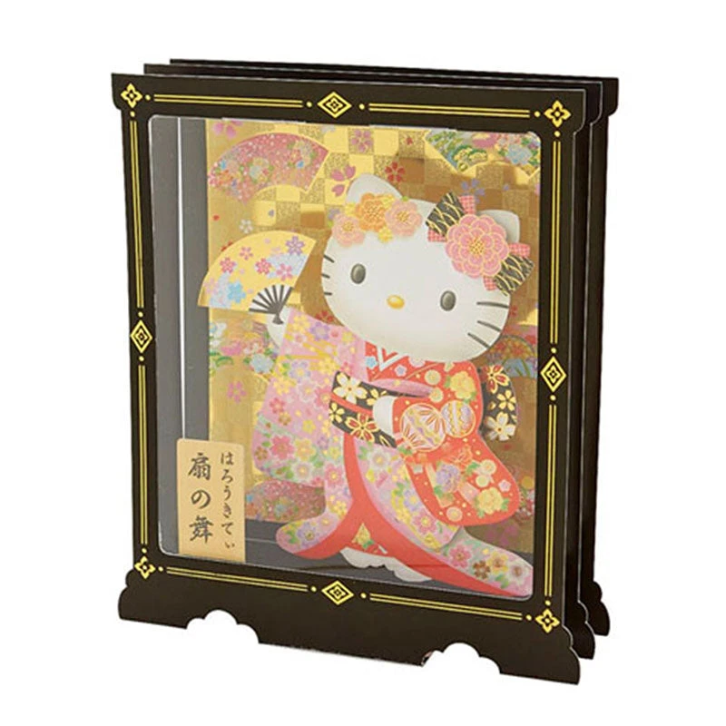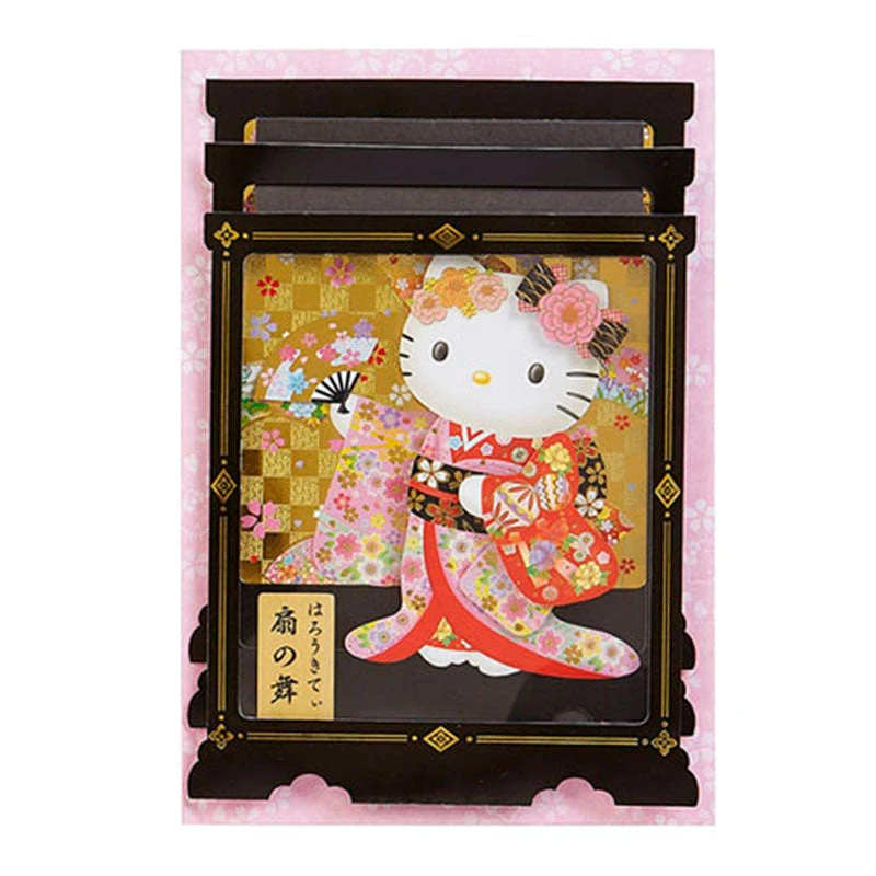 Write a special note to a friend or family member on this beautiful Hello Kitty Kimono and Fan Pop-Up Card! Features Hello Kitty in a detailed gold foil Kimono. Card can be displayed on your desk or shelf.