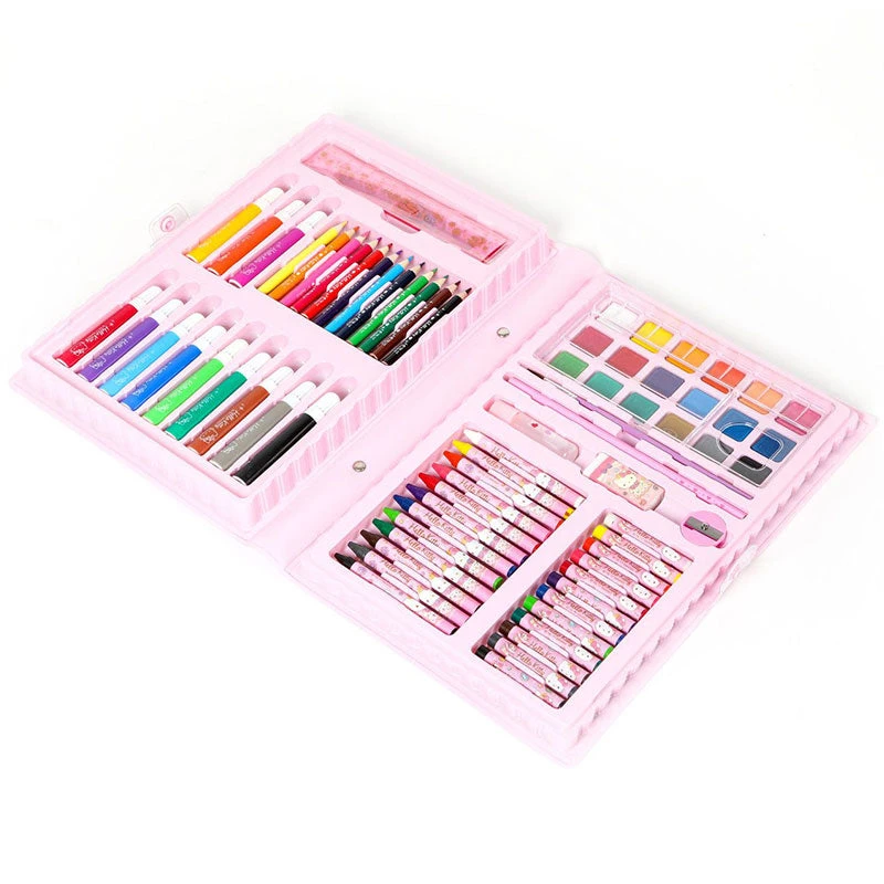 Comes with 12 Colored Markers, 12 Oil Pastels, 12 Crayons, 12 Colored Pencils, 18 Watercolors, 1 Paintbrush, 1 Palette, 1 Pencil, 1 Eraser, 1 Sharpener, 1 Ruler, 1 Gule, and 6 Paper clips in a cute carrying case.