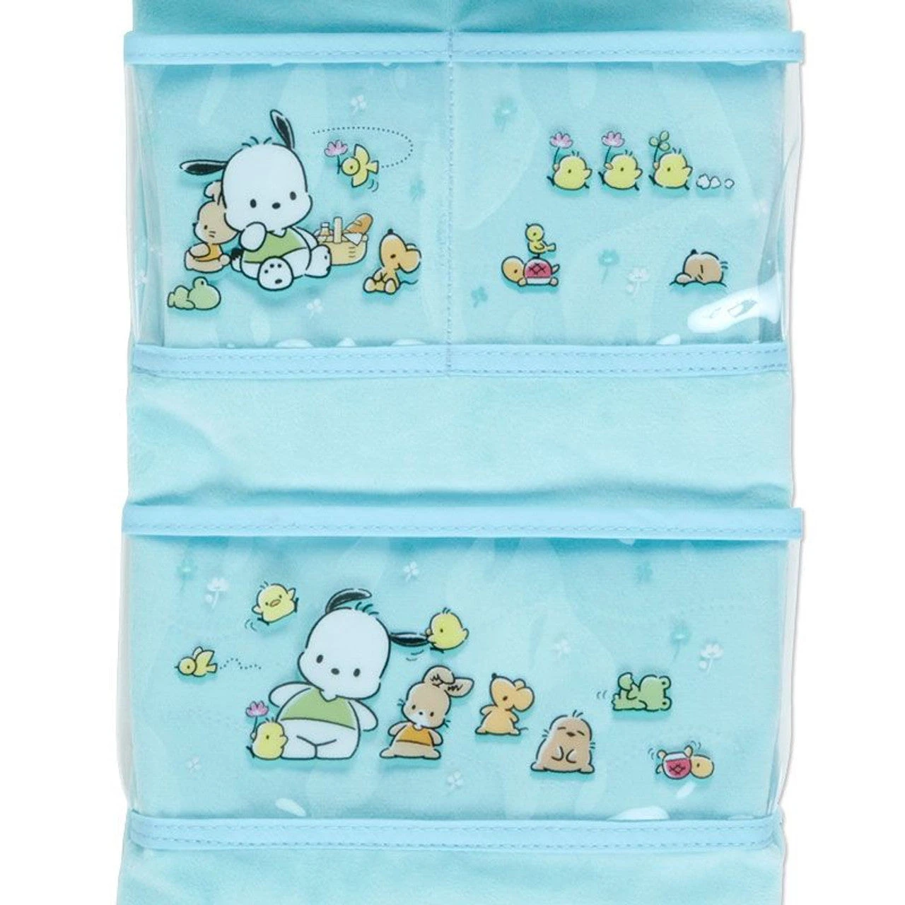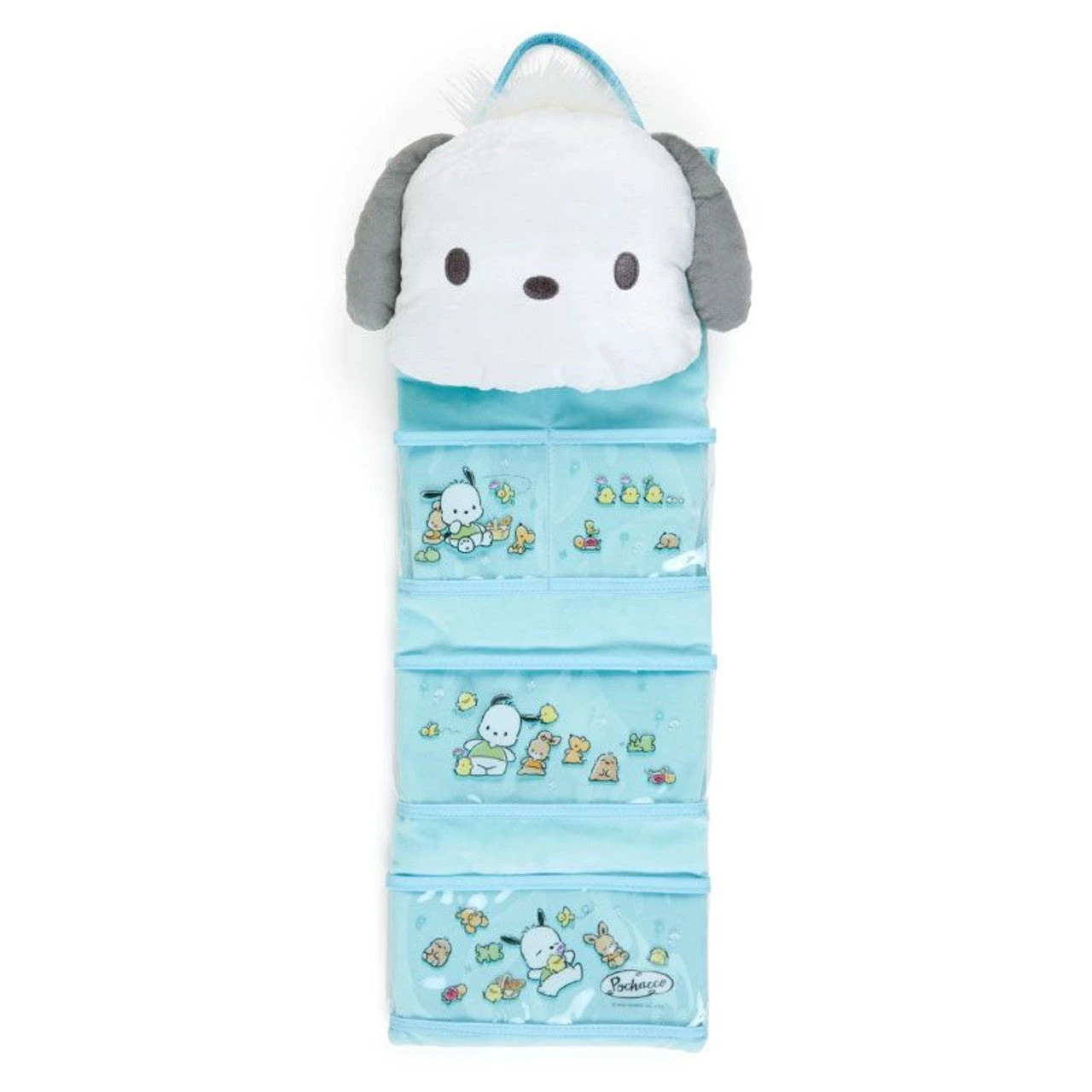 Organize your things with this cute Pochacco Spring Wall Pocket Organizer! This organizer features a big plush pochacco head, a loop for hanging on the wall, and 4 clear pockets for holding your toiletries and more.